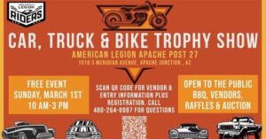 American Legion Apache Post 27 at 1018 S. Meridian Road, Apache Junction, Arizona 85120, hosted its Annual Car, Truck & Bike Trophy Show on Sunday, March 1, 2026, from 10 a.m. to 3 p.m. The public event featured food (hamburgers, hot dogs, and brats), vendors, a bake sale, and raffles.