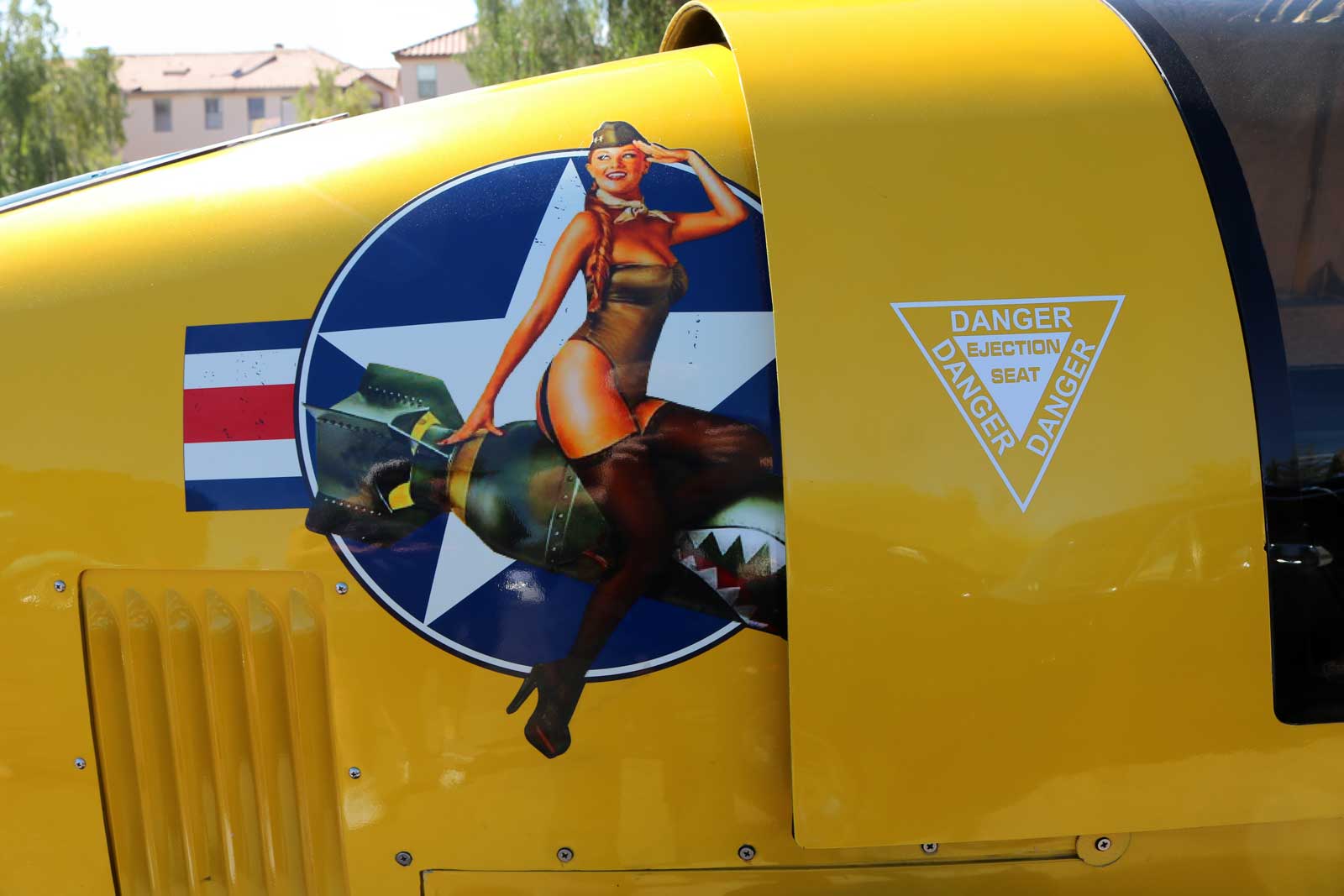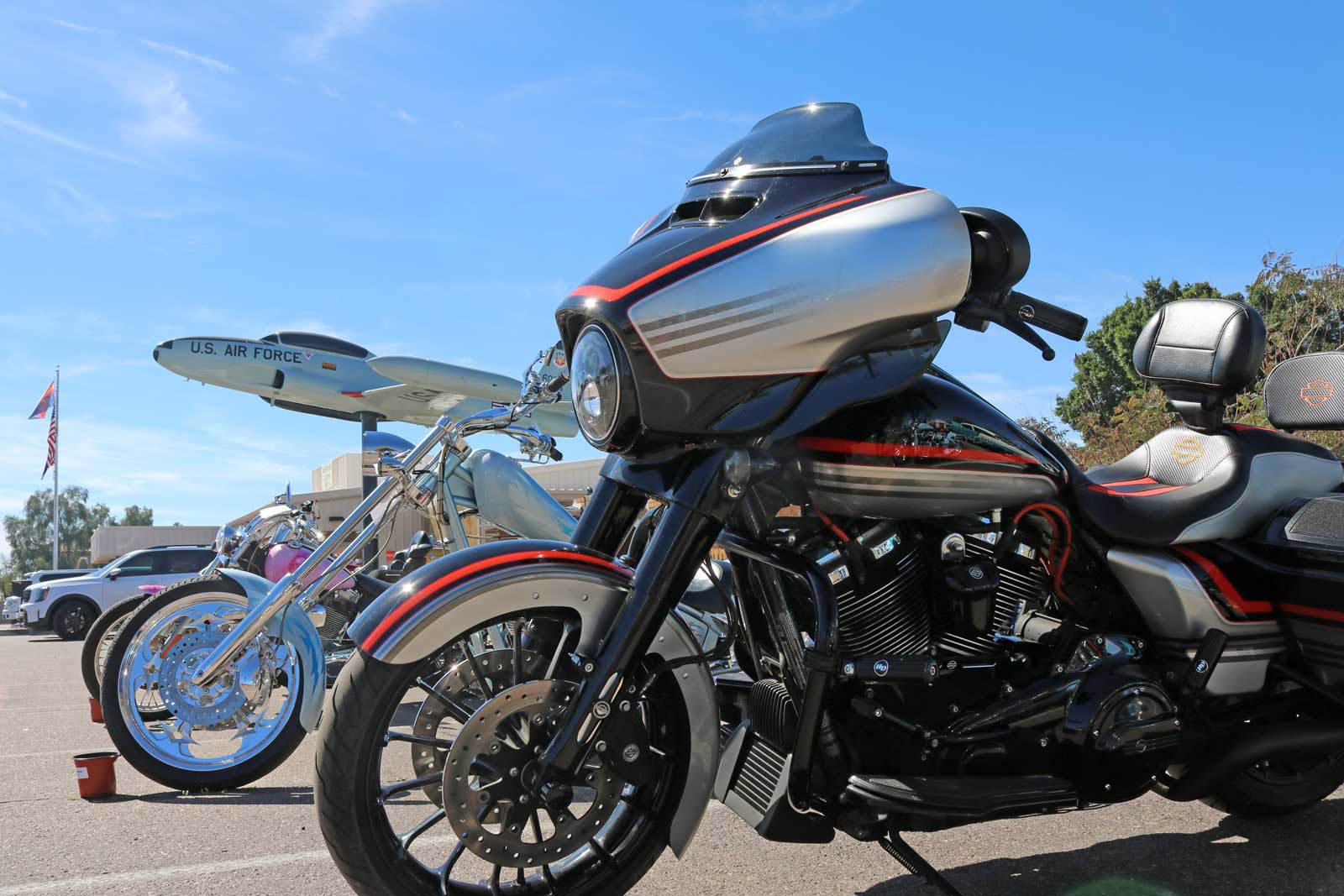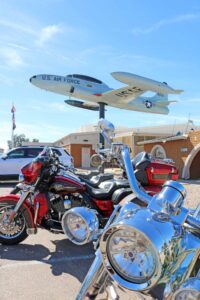 Also present was a great selection of custom motorcycles displayed along the east side of the lot, positioned perfectly for some great bike/airplane shots featuring the Lockheed T-33 Shooting Star jet trainer dedicated to the members of Apache Post 27 for their service to their country in peace and war. Acquired from the U.S. Air Force in the late 1960s, this aircraft is mounted on a pedestal as a memorial dedicated to local veterans and was recently refurbished a few months ago. I have been hoping for a reason to share this plane and its story for some time, and today offered a perfect opportunity to see it up close and thank our veterans for their service.