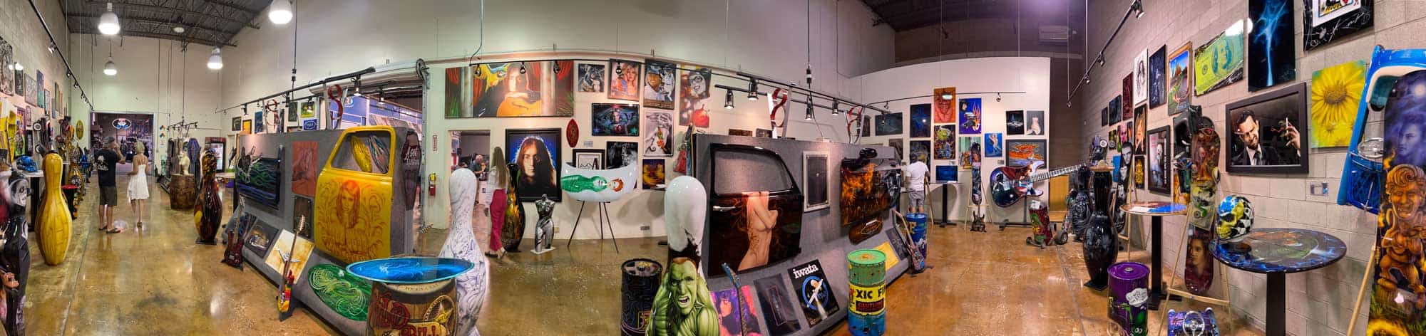 The Air Space Airbrush Gallery at ASET / Willy’s Garage showcases an amazing collection of original airbrush artworks from the industry’s top talent. One stroll through the gallery and you’ll see colorful oversized bowling pins, painted car doors and hoods, high-top tables, and miles of metal and canvas artworks.